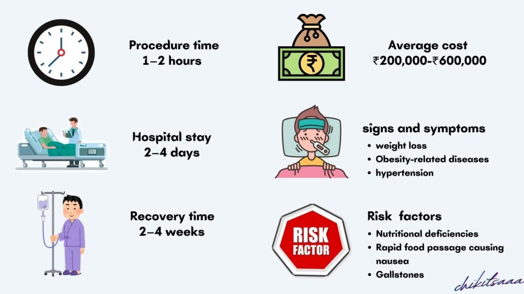 • Procedure Type: Sleeve gastrectomy (₹2.5–4 lakh); gastric bypass (₹3–5 lakh, more complex).