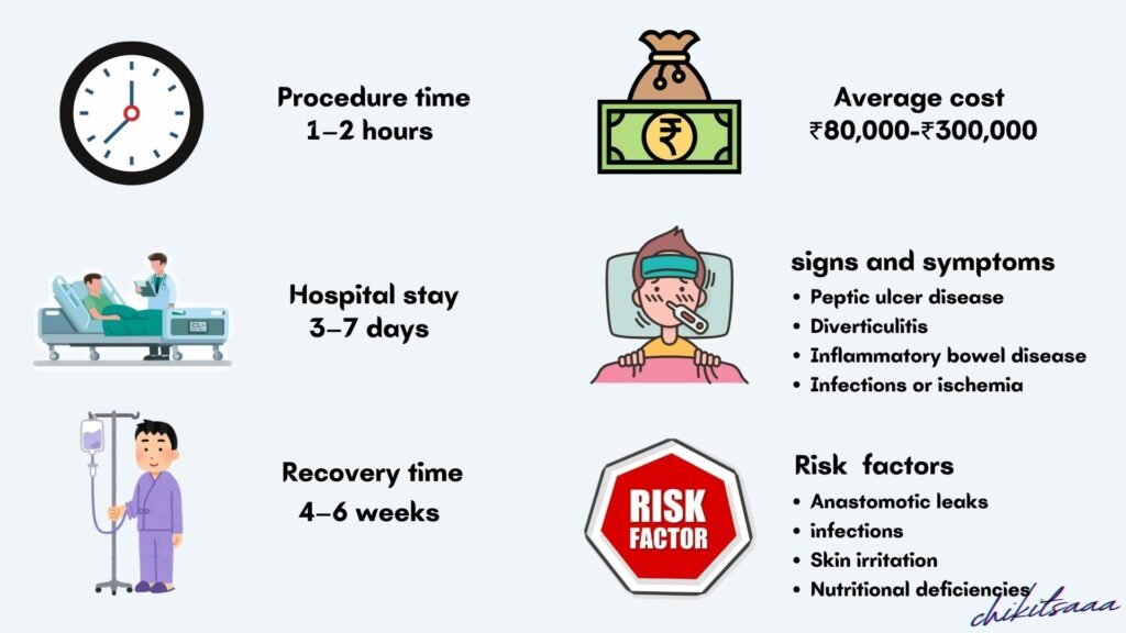 - Extra Costs: Diagnostics, ICU, medications, complications (e.g., sepsis), or stoma care supplies increase expenses.