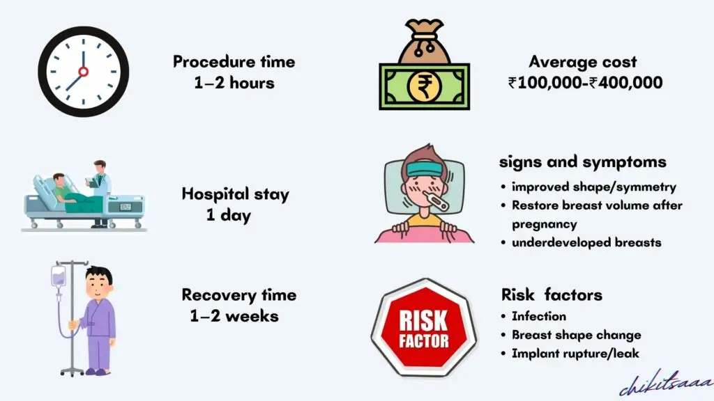 - Procedure Type: Saline implants (₹1–1.5 lakh); silicone implants (₹1.5–2.5 lakh); fat transfer (₹1.5–3 lakh).