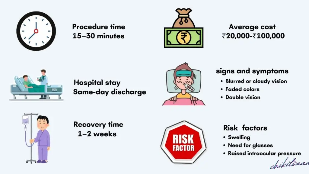 - Post-Surgery:- Posterior capsule opacification (PCO, 10–20% within 2 years): Clouding behind the IOL; treated with YAG laser capsulotomy (outpatient, ₹5,000–₹10,000 in India).
