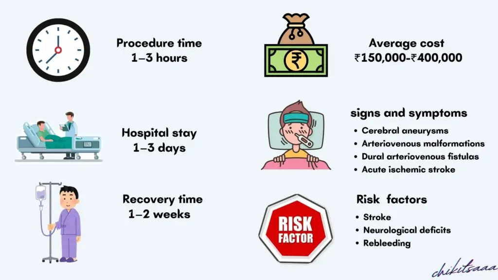 - Additional Costs: Embolic agents (e.g., Onyx, coils: ₹50,000–₹2 lakh), hospital stay, imaging (MRI/CT), ICU (if needed).