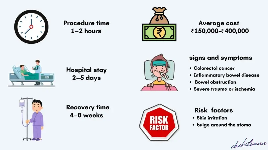 - Procedure: Open colostomy (₹1,00,000–₹3,00,000); laparoscopic (₹2,00,000–₹4,50,000); higher if combined with larger surgery.