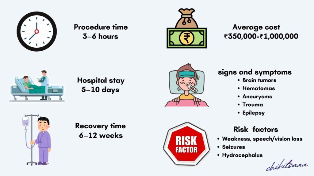 - Procedure Complexity: Simple craniotomy (e.g., hematoma evacuation, ₹1.5–3 lakh); complex (e.g., tumor resection, awake craniotomy, ₹3–8 lakh).