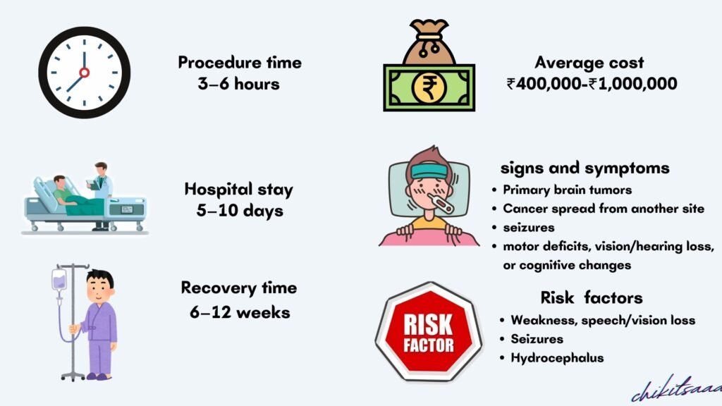 • Additional Costs: ICU stay (₹10,000–₹50,000/day), MRI/CT (₹5,000–₹15,000), intraoperative tools (e.g., neuronavigation), adjuvant therapy.