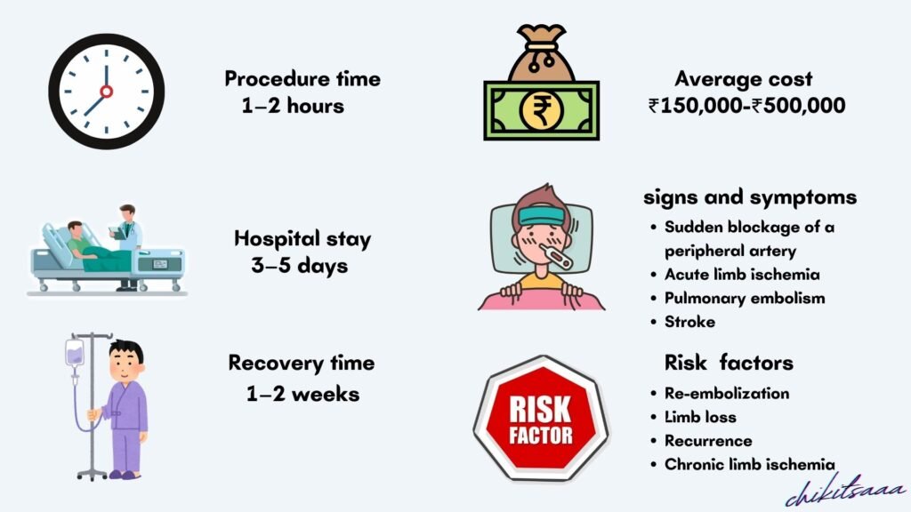 Embolectomy is a critical procedure for treating acute arterial embolism, with high success rates for limb salvage and restoring blood flow if performed timely. India’s top hospitals (Apollo, Fortis, AIIMS) provide affordable care, often covered by insurance. Understanding the procedure, costs, recovery, risks, and FAQs helps patients approach it confidently. Consult a vascular surgeon for personalized guidance.