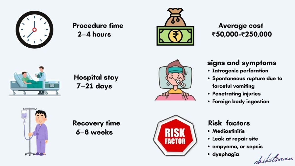 Esophageal perforation repair is an emergency surgical procedure to address a tear or hole in the esophagus, which can lead to life-threatening complications like mediastinitis, sepsis, or pneumothorax. The repair aims to close the perforation, drain associated infections, and prevent further leakage of esophageal contents into the chest or abdomen. In India, esophageal perforation repair is performed in specialized thoracic or gastroenterology surgery centers, offering high-quality care at affordable costs. For patients and families in India, understanding the procedure, costs, recovery, risks, and frequently asked questions (FAQs) is essential for informed decision-making and optimal outcomes.