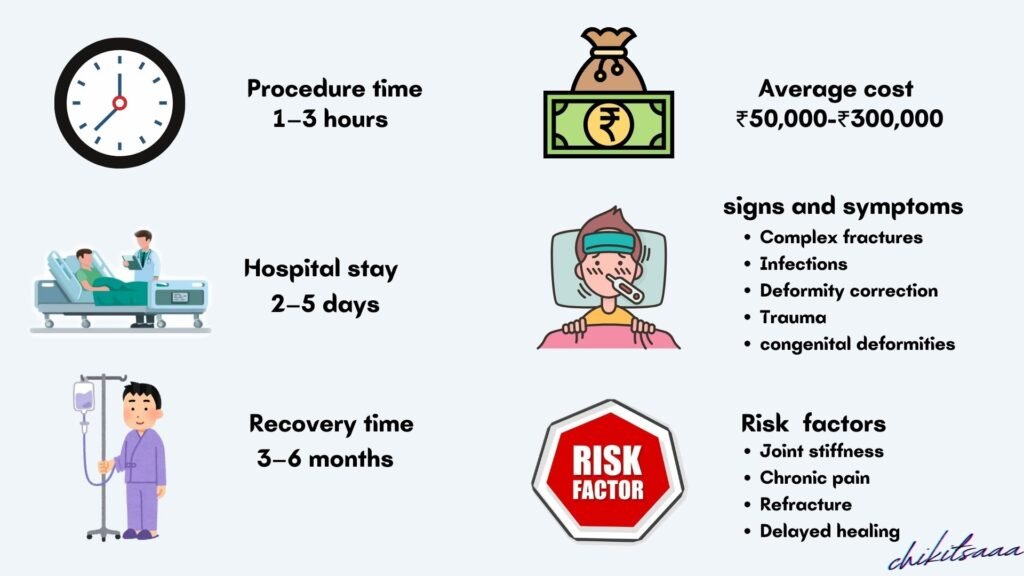 - Additional Costs: Fixator device (₹10,000–₹50,000), anesthesia (₹5,000–₹15,000), hospital stay (₹5,000–₹15,000/day), antibiotics/physiotherapy (₹5,000–₹20,000).