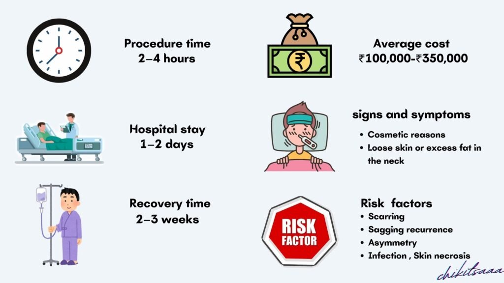 • Procedure Type: Mini facelift (₹1–1.5 lakh); traditional/SMAS facelift (₹1.5–2.5 lakh); deep plane (₹2.5–3.5 lakh).