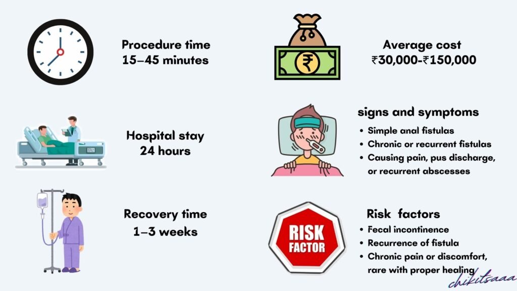 - Extra Costs: Diagnostics (MRI, proctoscopy), anesthesia, medications, or care for complex/recurrent fistulas add to expenses.