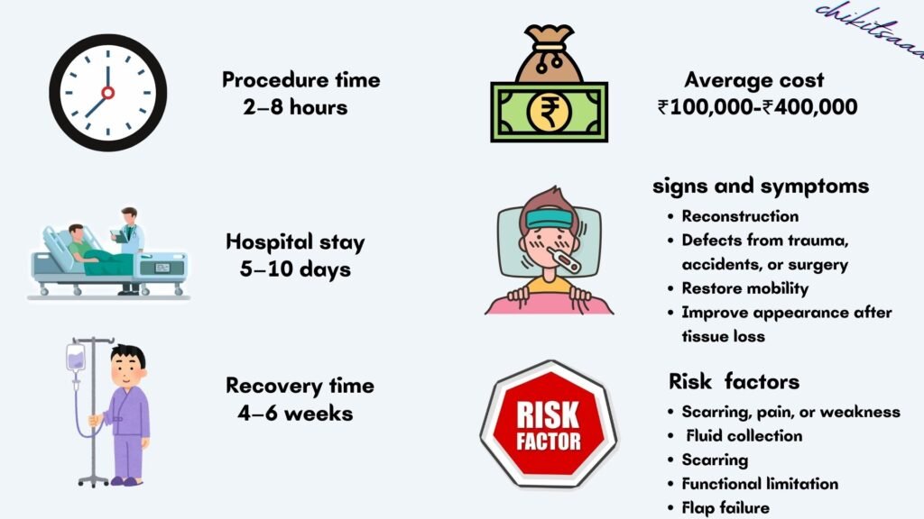 Flap surgery is a reconstructive procedure that involves transferring a piece of tissue (skin, fat, muscle, or bone) along with its blood supply from one part of the body (donor site) to another (recipient site) to repair defects, restore function, or improve appearance. It’s commonly used in plastic and reconstructive surgery. In India, flap surgery is conducted in plastic surgery or reconstructive departments at hospitals like Apollo, Fortis, Medanta, Tata Memorial, and AIIMS, often at affordable costs. Understanding the procedure, costs, recovery, risks, and FAQs is essential for patients.