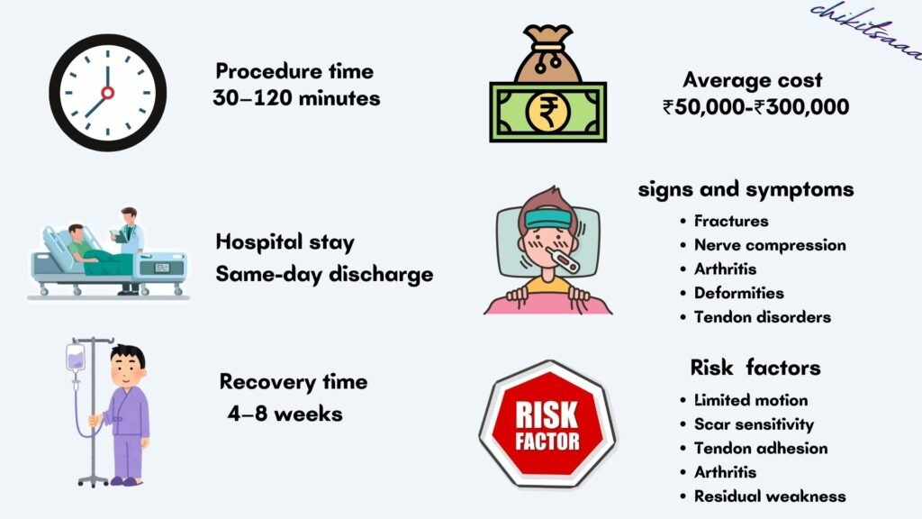 - Additional Costs: Anesthesia (₹5,000–₹15,000), hospital stay (₹5,000–₹15,000/day), hardware (e.g., screws: ₹5,000–₹20,000), hand therapy (₹5,000–₹15,000 for 1–2 months).
