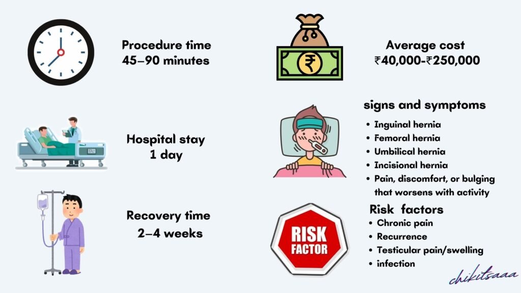 - Additional Costs: Mesh (₹10,000–₹30,000), hospital stay, diagnostics (ultrasound, CT), emergency bowel resection.
