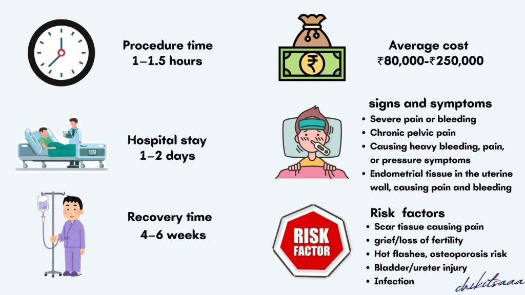- After Surgery:- Hospital stay: 1–2 days (laparoscopic/vaginal); 3–5 days (abdominal).