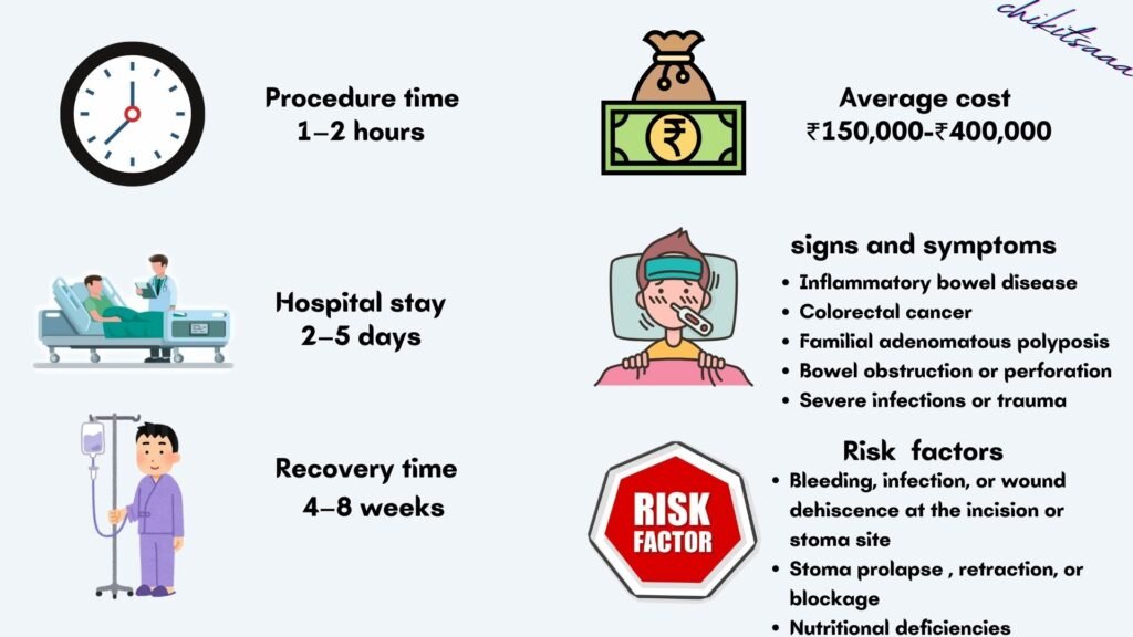 - Extra Costs: Diagnostics (colonoscopy, CT), ICU stays, medications, ileostomy supplies (₹2,000–₹5,000 monthly), or post-surgery treatments (e.g., chemotherapy, J-pouch surgery) add to expenses.