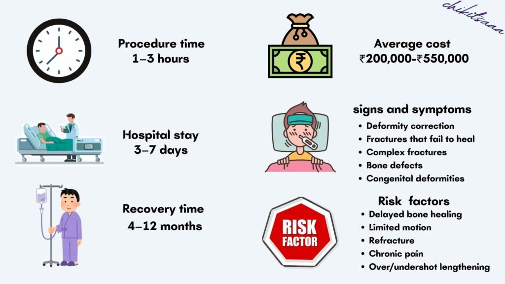 - Additional Costs: Ilizarov frame (₹20,000–₹60,000), anesthesia (₹5,000–₹15,000), hospital stay (₹5,000–₹15,000/day), antibiotics/physiotherapy (₹10,000–₹30,000).