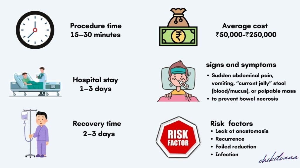 - Procedure Type: Air enema (₹30,000–₹50,000); surgical reduction (₹80,000–₹1.5 lakh, higher if resection needed).