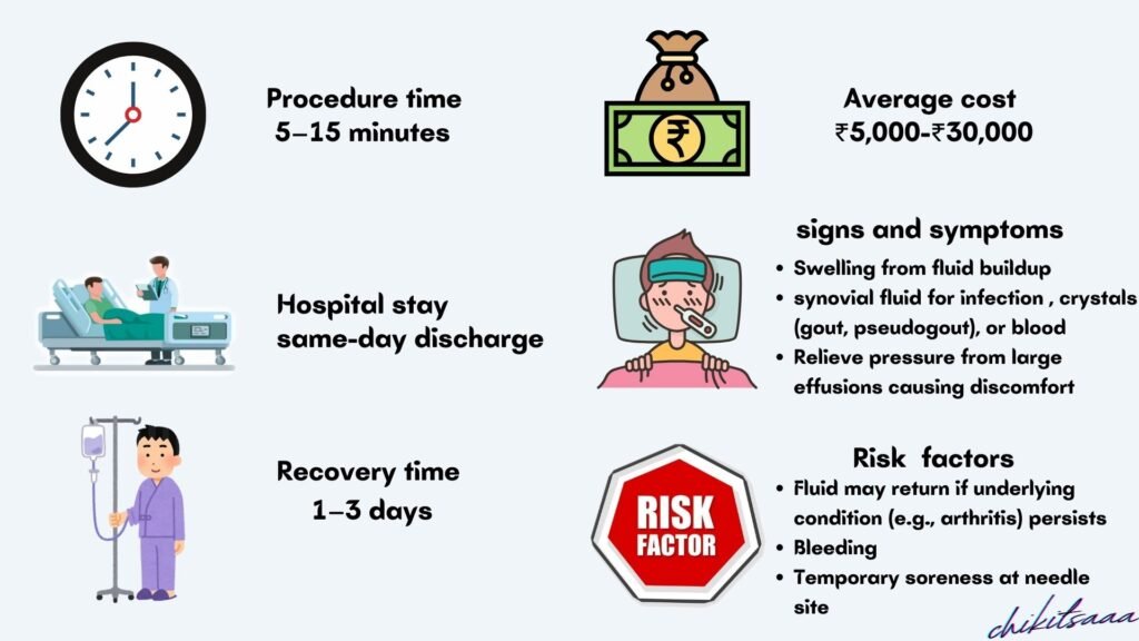 Joint aspiration, or arthrocentesis, is a procedure where a needle is inserted into a joint to remove fluid for diagnostic purposes (e.g., infection, gout) or to relieve pressure and pain from fluid buildup (e.g., effusion). It’s commonly performed on joints like the knee, shoulder, or ankle. In India, arthrocentesis is done in orthopedic or rheumatology departments at hospitals like Apollo, Fortis, Medanta, and AIIMS, often at affordable costs. Understanding the procedure, costs, recovery, risks, and FAQs is essential for patients.