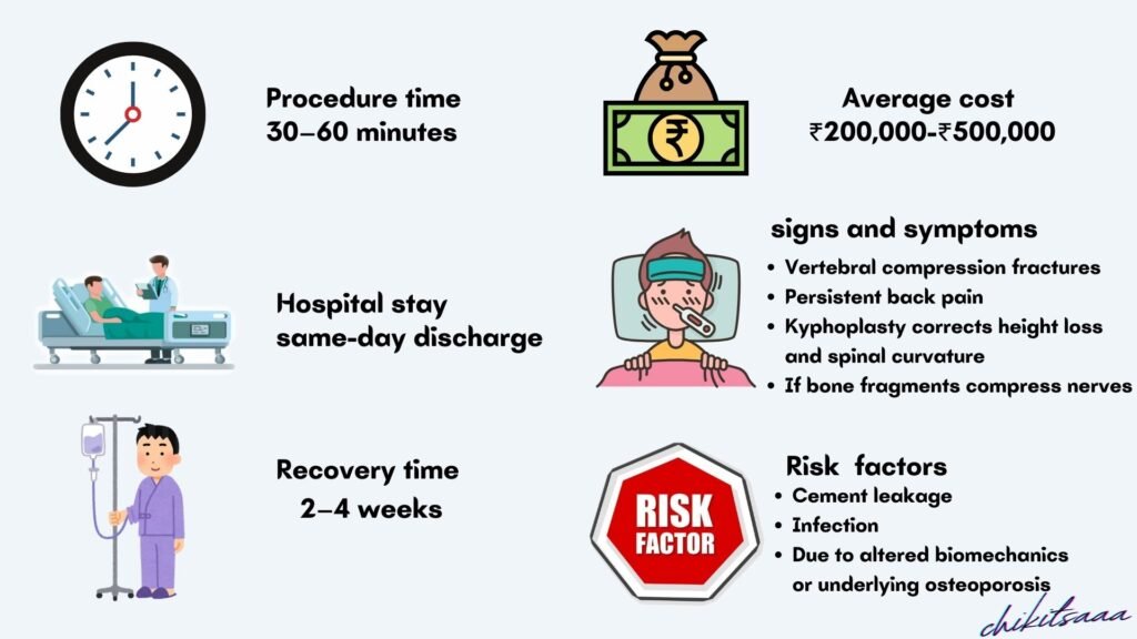 - Additional Costs: Cement (₹20,000–₹50,000 per level), MRI/CT (₹5,000–₹15,000), hospital stay, bone density test.