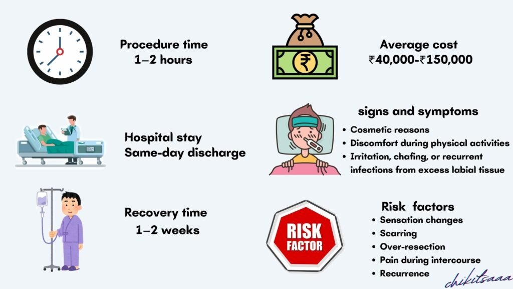 Labiaplasty is a safe and effective procedure to address labial concerns, with high satisfaction rates and manageable recovery. India’s top hospitals (Apollo, Fortis, Medanta) provide affordable care, though insurance coverage is limited for cosmetic cases. Understanding the procedure, costs, recovery, risks, and FAQs helps patients approach surgery confidently. Consult a plastic surgeon or gynecologist for personalized guidance.