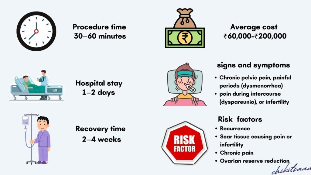 - Procedure Complexity: Diagnostic (₹80,000–₹1.5 lakh); excision with endometrioma (₹1.5–2.5 lakh); DIE with bowel/bladder involvement (₹2.5–3 lakh).