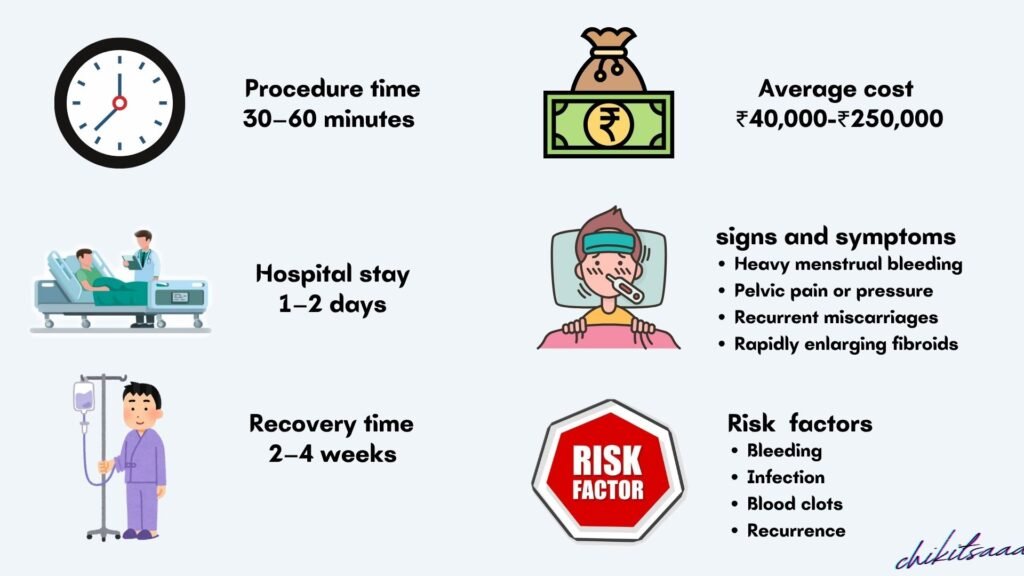 - Hospital Stay: 1–2 days (laparoscopic/hysteroscopic); 3–5 days (abdominal).