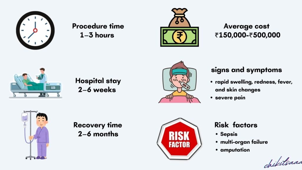 - Additional Costs: ICU stay (₹10,000–₹50,000/day), antibiotics, VAC therapy, skin grafting, prolonged hospitalization.