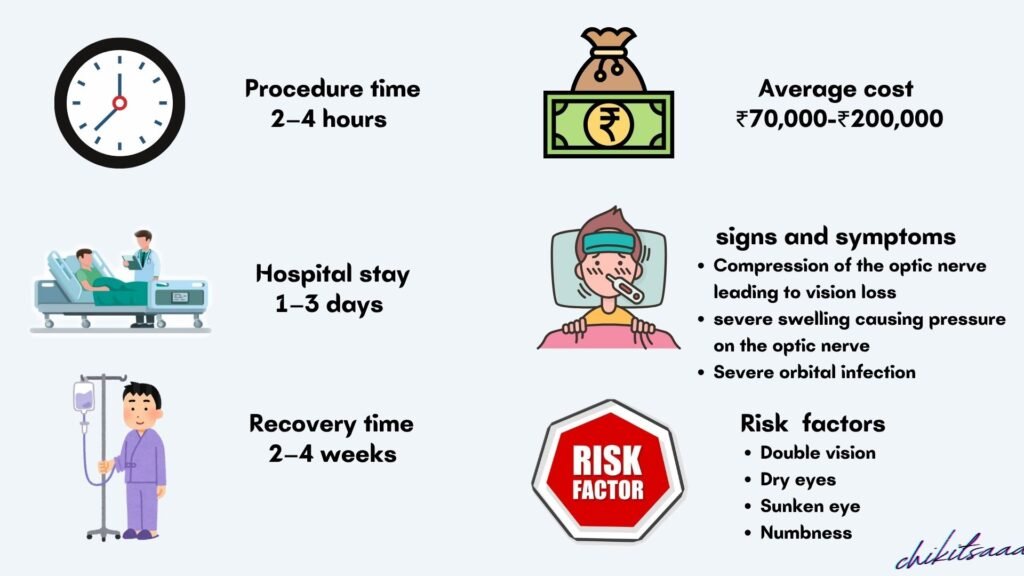 Orbital decompression is an effective procedure to manage severe proptosis or optic nerve compression, improving function and appearance with a good success rate. India’s top hospitals (Apollo, Fortis, AIIMS) provide affordable, expert care, often covered by insurance for medical necessity. Understanding the procedure, costs, recovery, risks, and FAQs helps patients approach surgery confidently. Consult an oculoplastic surgeon for personalized guidance and optimal outcomes.