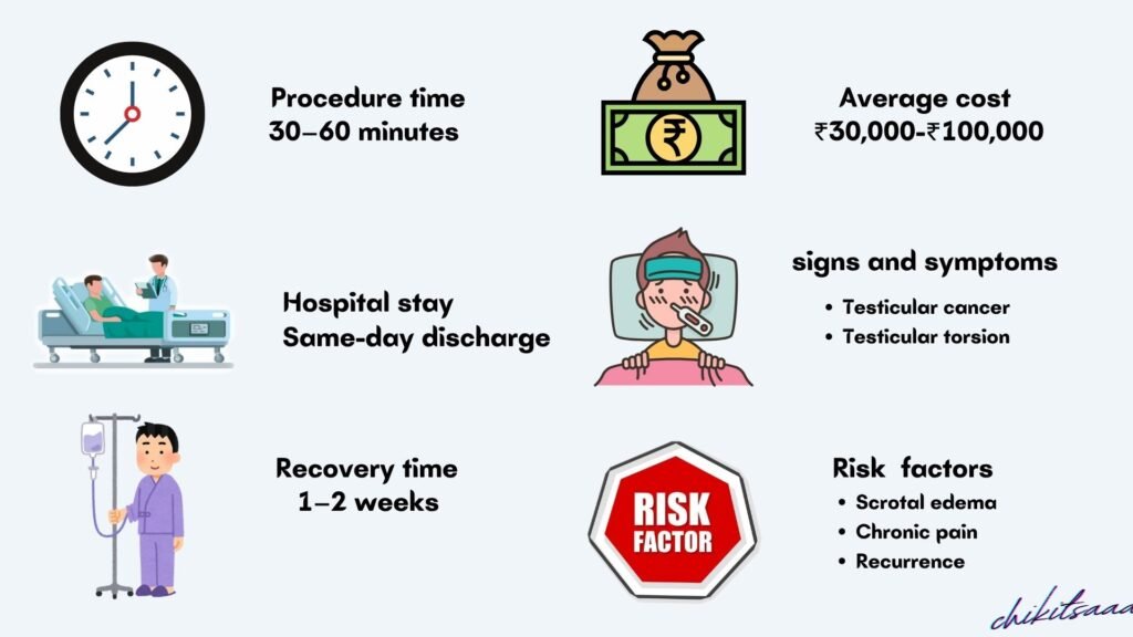 • Procedure Type: Simple/scrotal (₹30,000–₹50,000); radical inguinal (₹50,000–₹80,000); with prosthesis (₹80,000–₹1 lakh).
