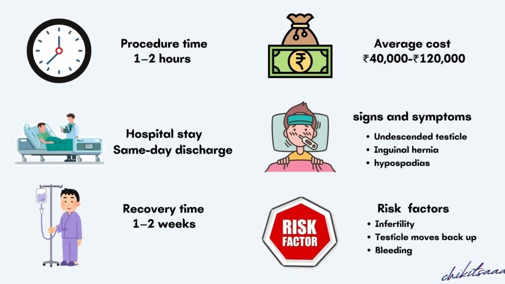 - Procedure Type: Inguinal orchiopexy (₹40,000–₹70,000); laparoscopic (₹70,000–₹1.2 lakh).