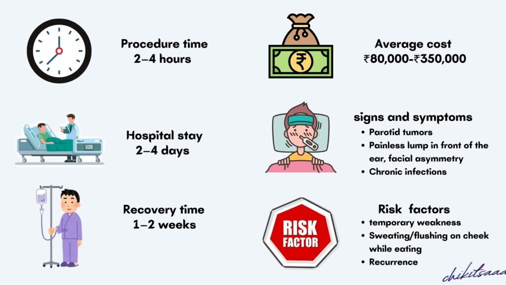 • Procedure Type: Superficial parotidectomy (₹80,000–₹1.5 lakh); total parotidectomy (₹1.5–2.5 lakh).