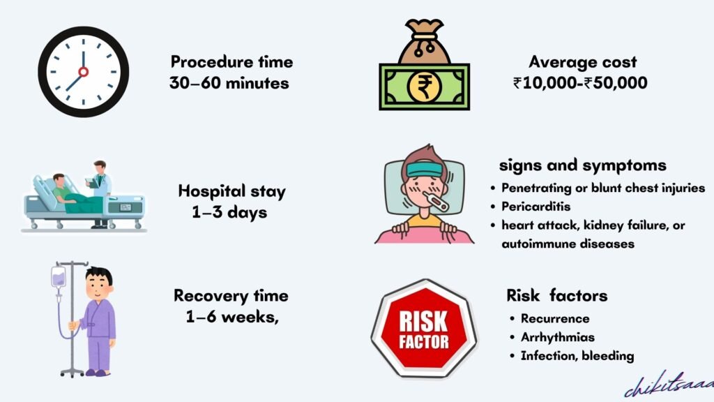 - Hospital Stay:- Pericardiocentesis patients typically stay 1–3 days, often discharged within 24–48 hours if stable.