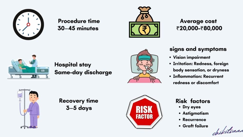 • Additional Costs: Pre-op tests (₹1,000–₹3,000), medications (₹1,000–₹3,000), fibrin glue or AMT (₹5,000–₹10,000).