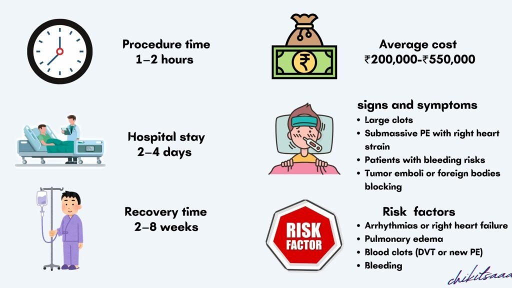 • Procedure Type: Catheter-directed embolectomy (₹1.5–4 lakh) is cheaper than open surgical embolectomy (₹3–7 lakh); ECMO support adds ₹50,000–₹2 lakh/day.