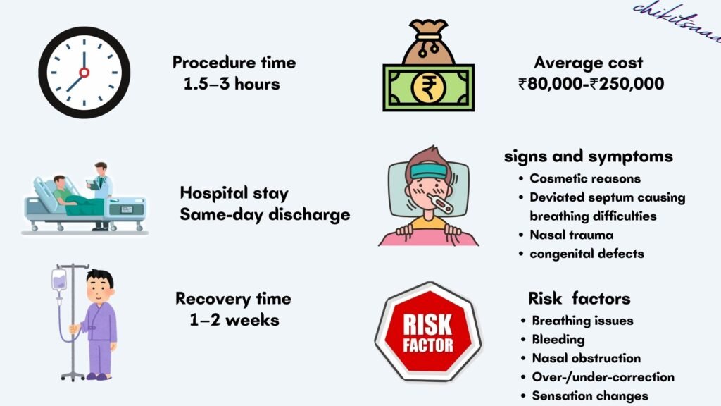 Rhinoplasty is a safe and effective procedure to enhance nasal appearance or function, with high satisfaction rates and manageable recovery. India’s top hospitals (Apollo, Fortis, Medanta) provide affordable care, with insurance coverage for functional cases. Understanding the procedure, costs, recovery, risks, and FAQs helps patients approach surgery confidently. Consult a plastic surgeon or ENT specialist for personalized guidance.