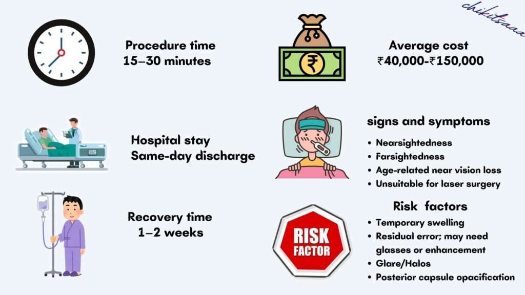 Refractive Lens Exchange is a safe, effective procedure to correct high refractive errors and presbyopia, offering freedom from glasses with a high success rate. India’s top hospitals (Apollo, Fortis, AIIMS) provide affordable, expert care, though insurance coverage is limited unless cataracts are present. Understanding the procedure, costs, recovery, risks, and FAQs helps patients approach surgery confidently. Consult an ophthalmologist for personalized guidance and optimal outcomes.