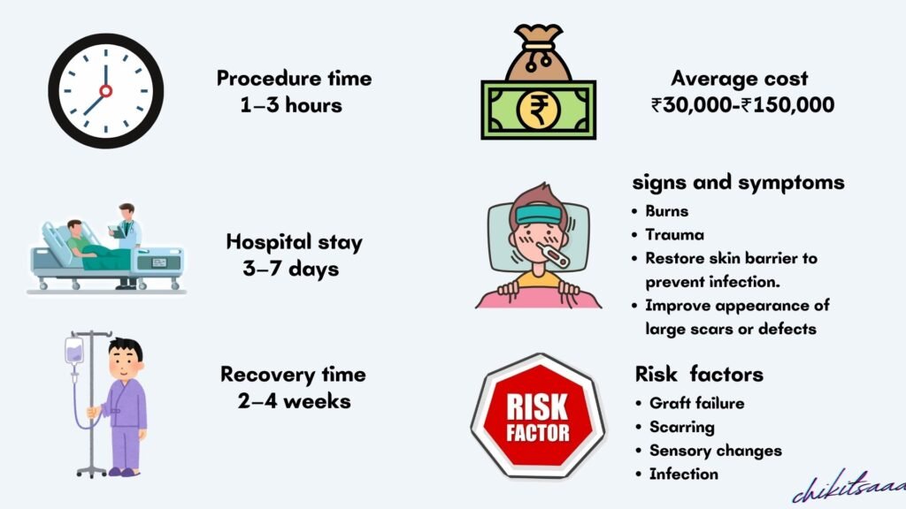 Skin grafting is a reliable reconstructive procedure to repair defects and restore function, with high success rates in experienced hands. India’s top hospitals (Apollo, Fortis, Safdarjung) provide affordable care, often covered by insurance for reconstructive cases. Understanding the procedure, costs, recovery, risks, and FAQs helps patients approach surgery confidently. Consult a plastic surgeon for personalized guidance.