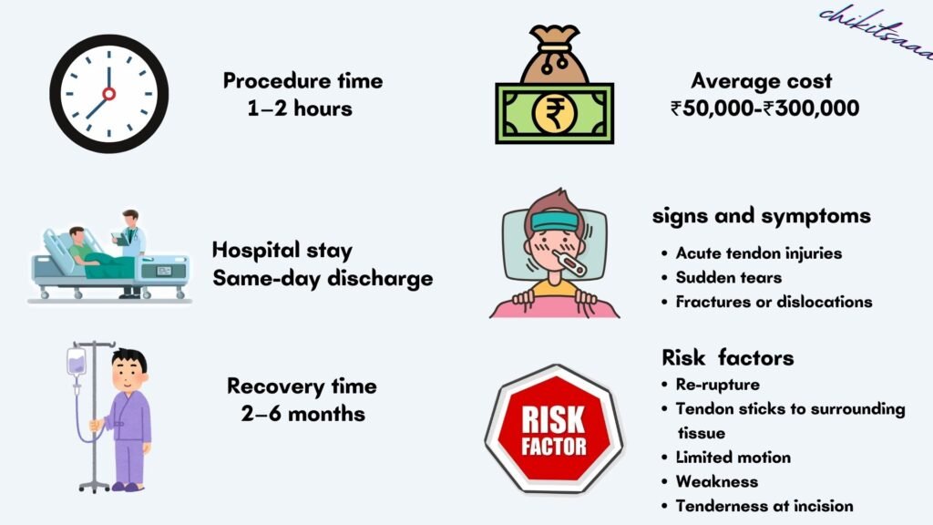 - After Surgery:- Hospital stay: Same-day discharge (hand tendons); 1–2 days (Achilles, rotator cuff).