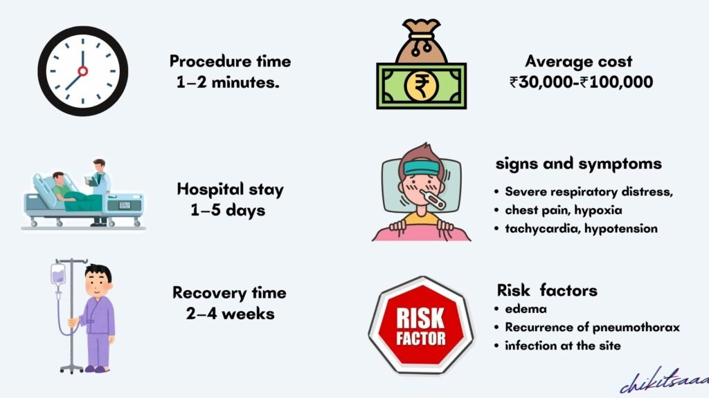 • Procedure Type: Needle decompression alone is inexpensive (₹20,000–₹50,000); costs rise with chest tube insertion and hospital stay (₹50,000–₹1.5 lakh).