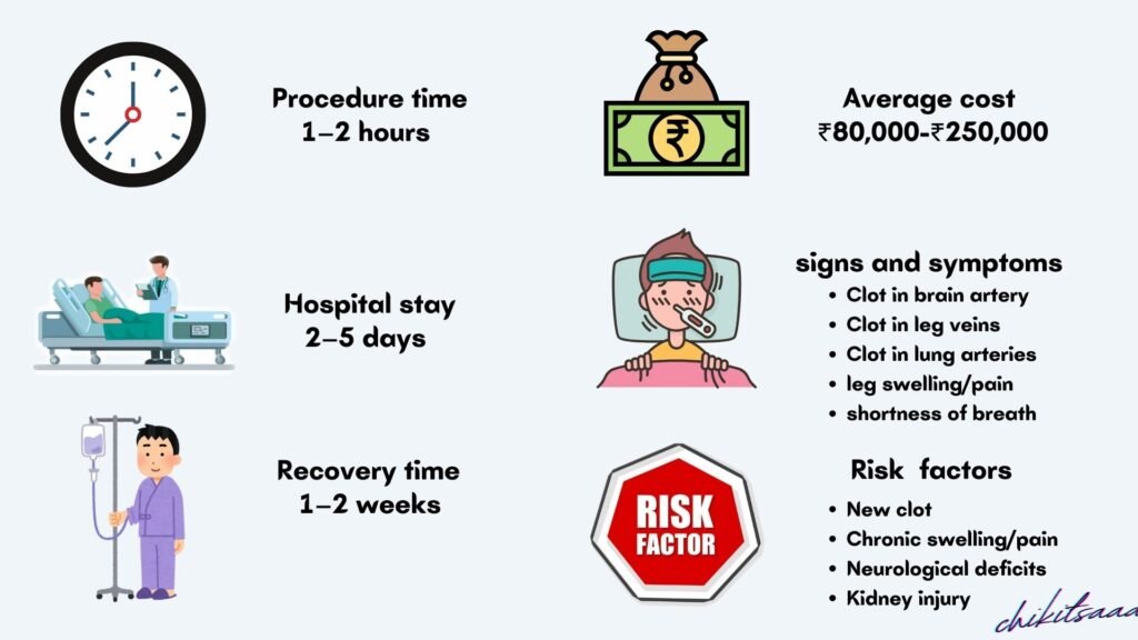 - After Procedure:- Hospital stay: 2–5 days (stroke); 1–3 days (DVT/PE).