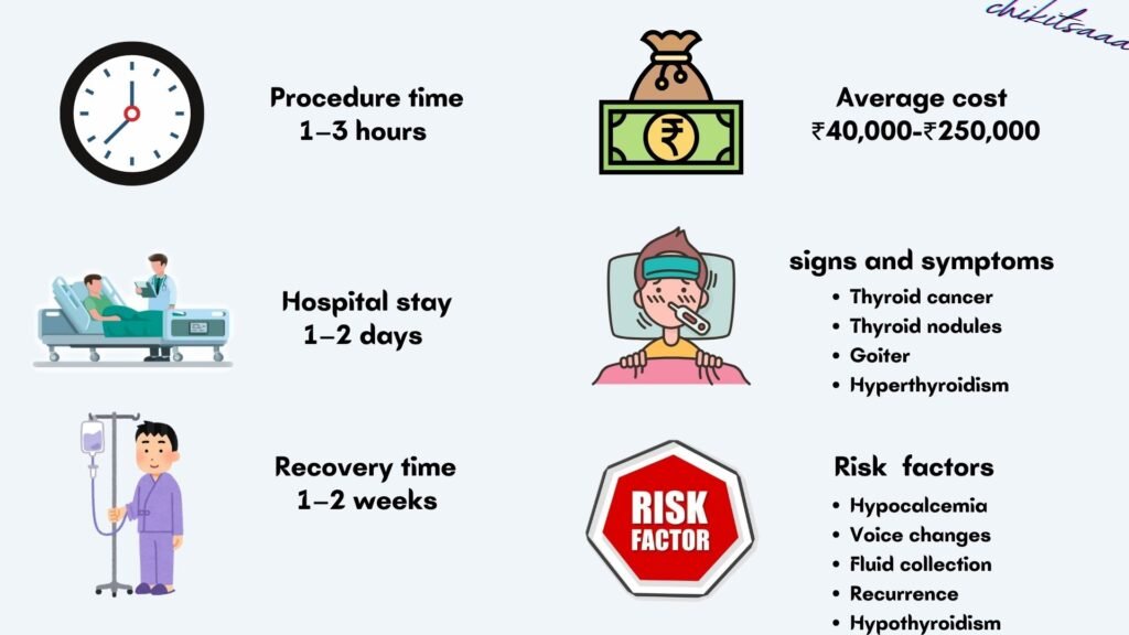 • Procedure Type: Hemithyroidectomy (₹50,000–₹80,000); total/open (₹80,000–₹1.5 lakh); robotic (₹1.5–2 lakh).