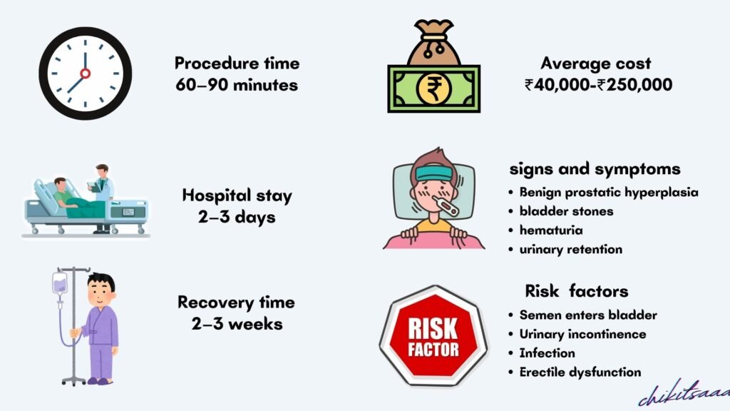 • Post-op: Catheter for 1–3 days to drain urine; bladder irrigation to prevent clots.