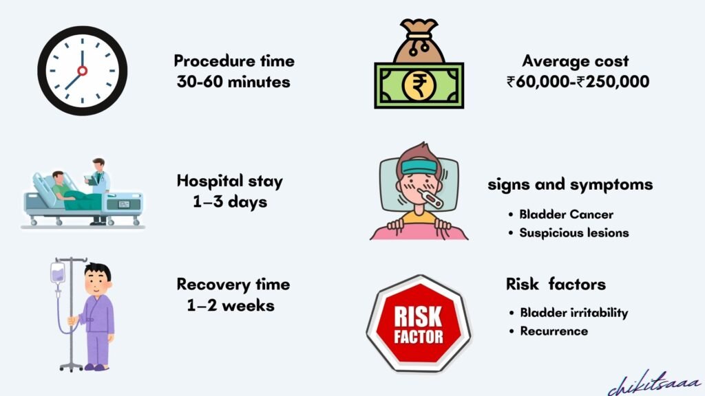 - Procedure Complexity: Simple TURBT (₹50,000–₹80,000); with intravesical therapy or blue light (₹80,000–₹1.5 lakh).