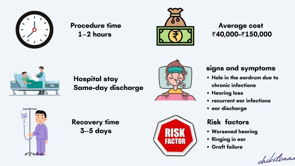 - Procedure Type: Type I (myringoplasty, ₹40,000–₹60,000); Type II–V (with ossicular repair, ₹60,000–₹1 lakh).