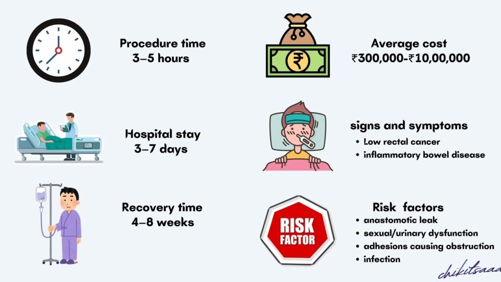 • Additional Costs: Diagnostics (MRI, CT), ICU, neoadjuvant/adjuvant therapy (₹1–3 lakh), stoma supplies (₹2,000–₹5,000/month).