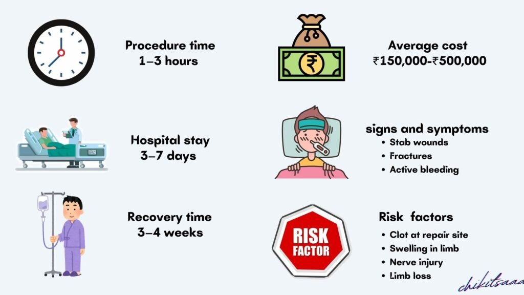 Vascular trauma repair is a surgical procedure to address injuries to blood vessels (arteries or veins) caused by trauma, such as penetrating injuries (e.g., stab wounds), blunt trauma (e.g., fractures), or iatrogenic causes (e.g., catheter complications). It aims to control bleeding, restore blood flow, and prevent ischemia or amputation. In India, this procedure is performed in vascular surgery or trauma surgery departments at hospitals like Apollo, Fortis, Medanta, and AIIMS, often at affordable costs. Understanding the procedure, costs, recovery, risks, and FAQs is essential for patients.
